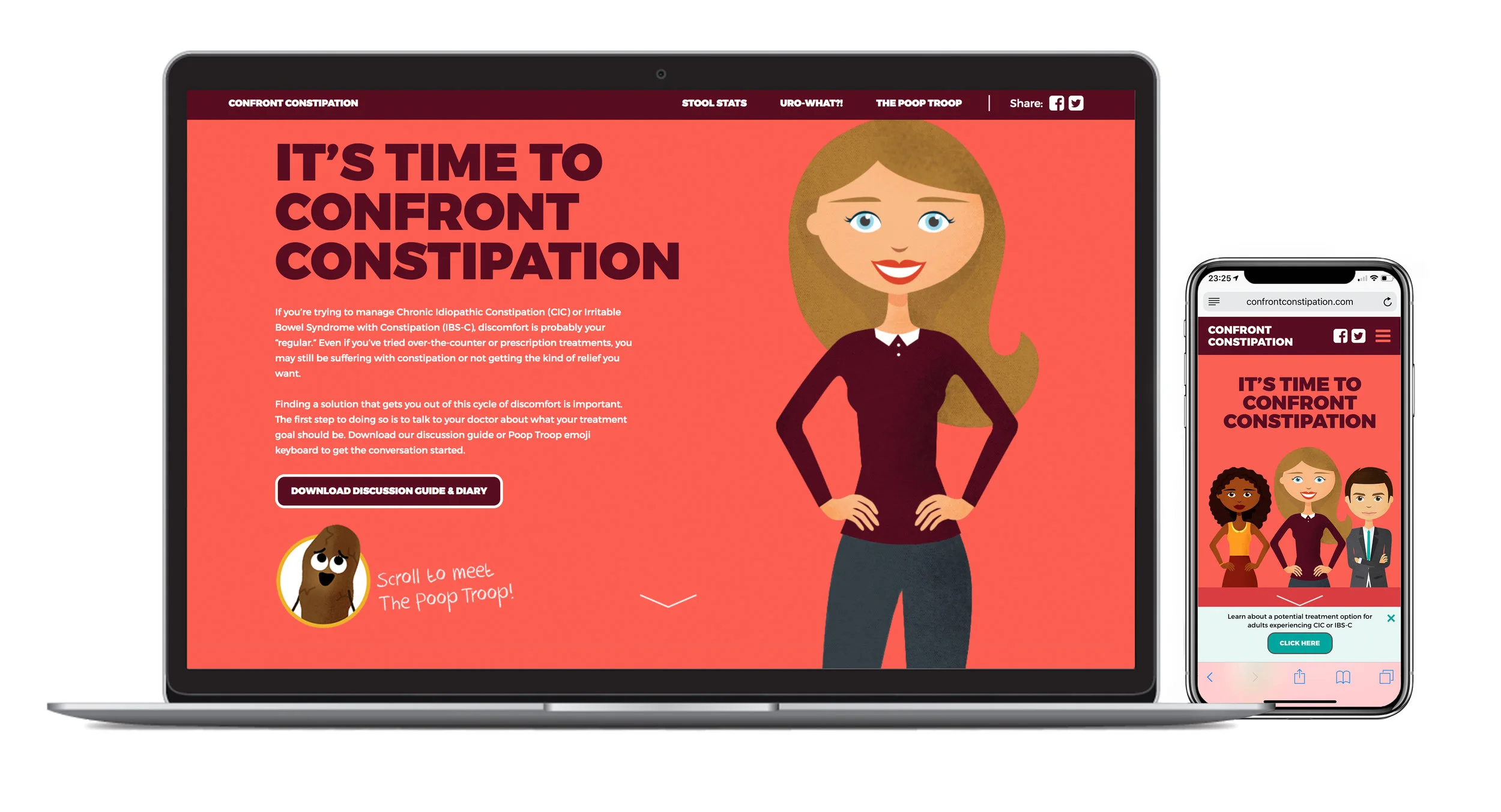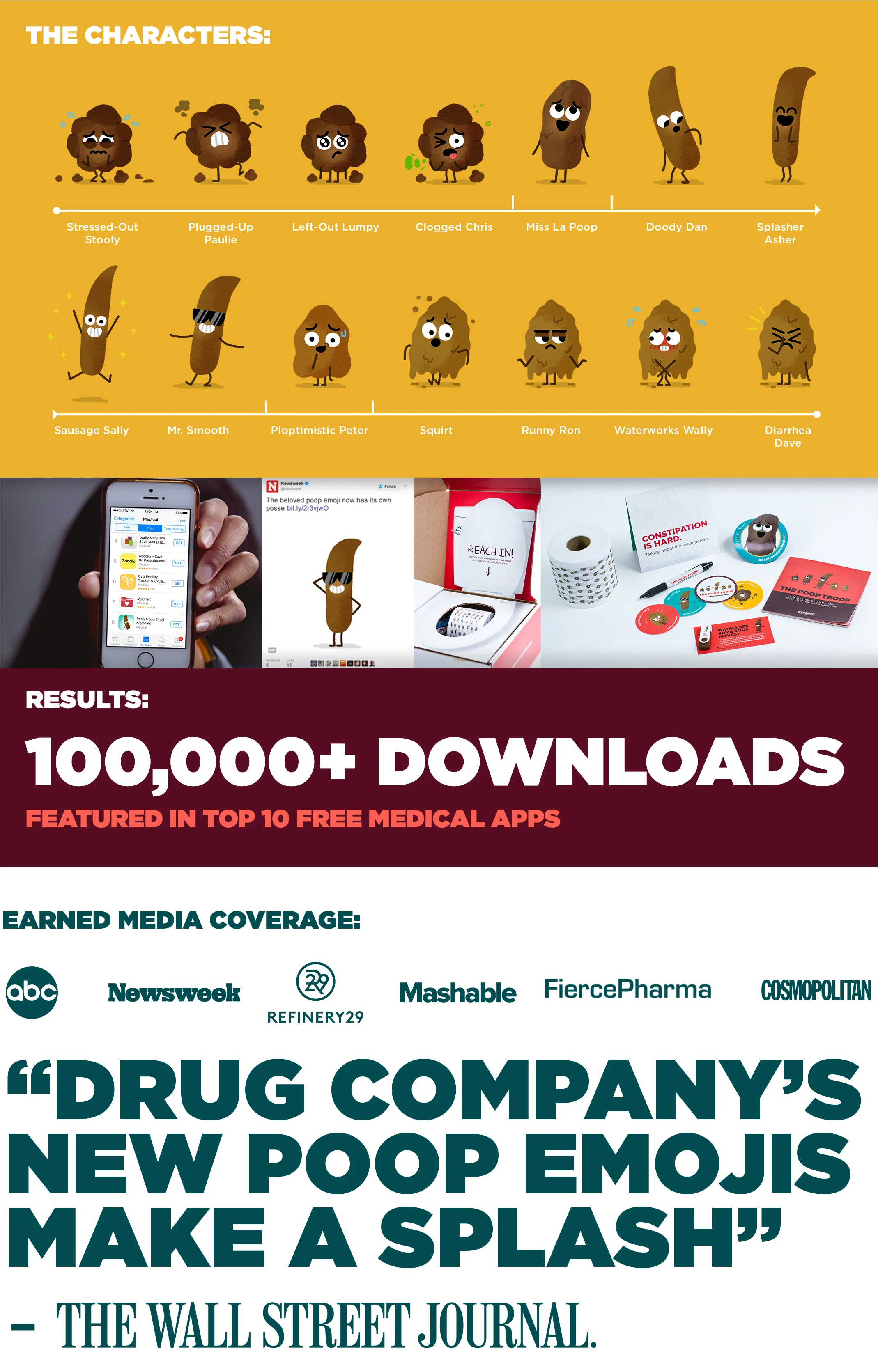 So we introduced the world to the Poop Troop. Inspired by the clinically-accepted Bristol Stool Scale, we literally created a new language to help people more effectively describe their bowel movements and the emotions associated with their symptoms to their doctors. The Poop Troop could help alleviate the frustration and embarrassment of the constipation conversation.